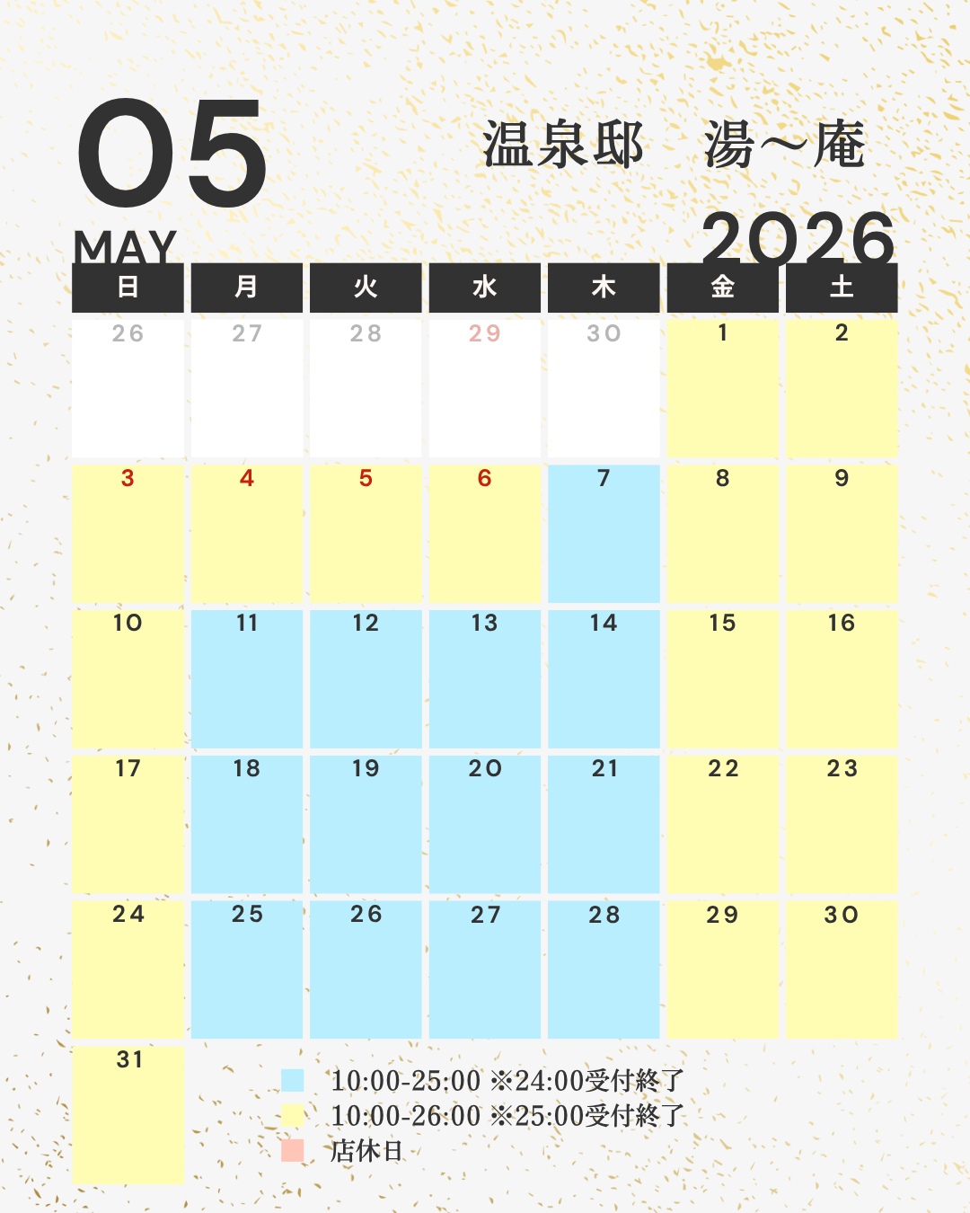 5月の営業情報《温泉邸 湯~庵》