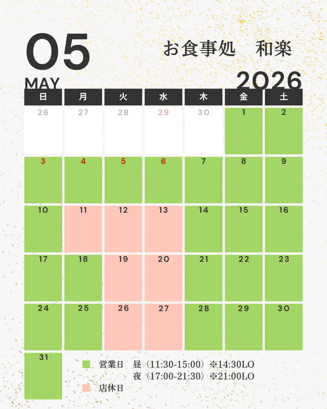 5月の営業情報《お食事処 和楽》