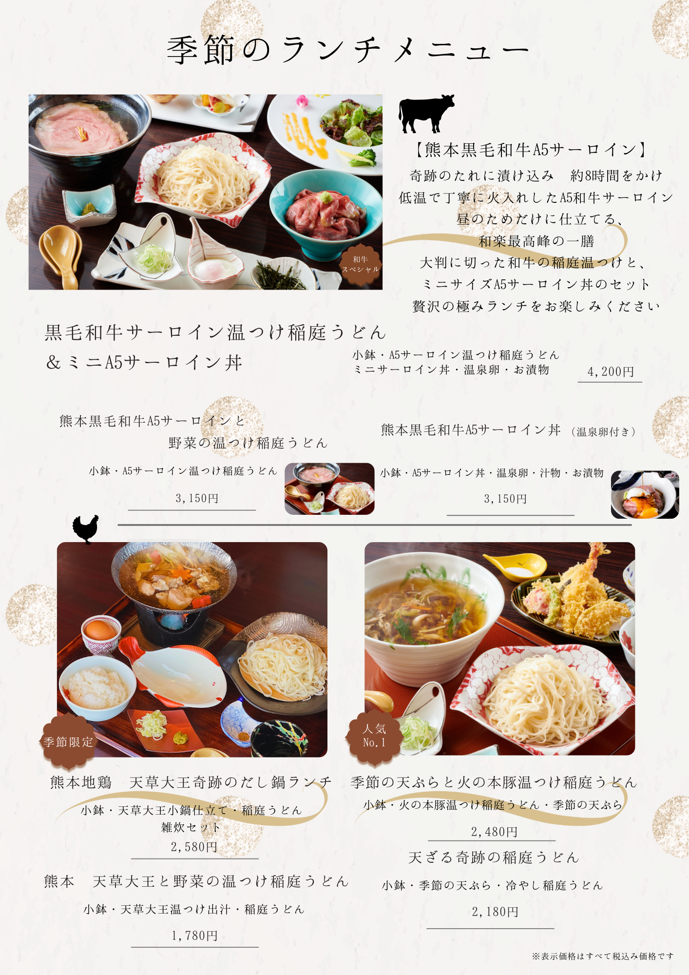 ・熊本黒毛和牛A5サーロインと野菜の温つけ稲庭うどん 3,150円(税込)