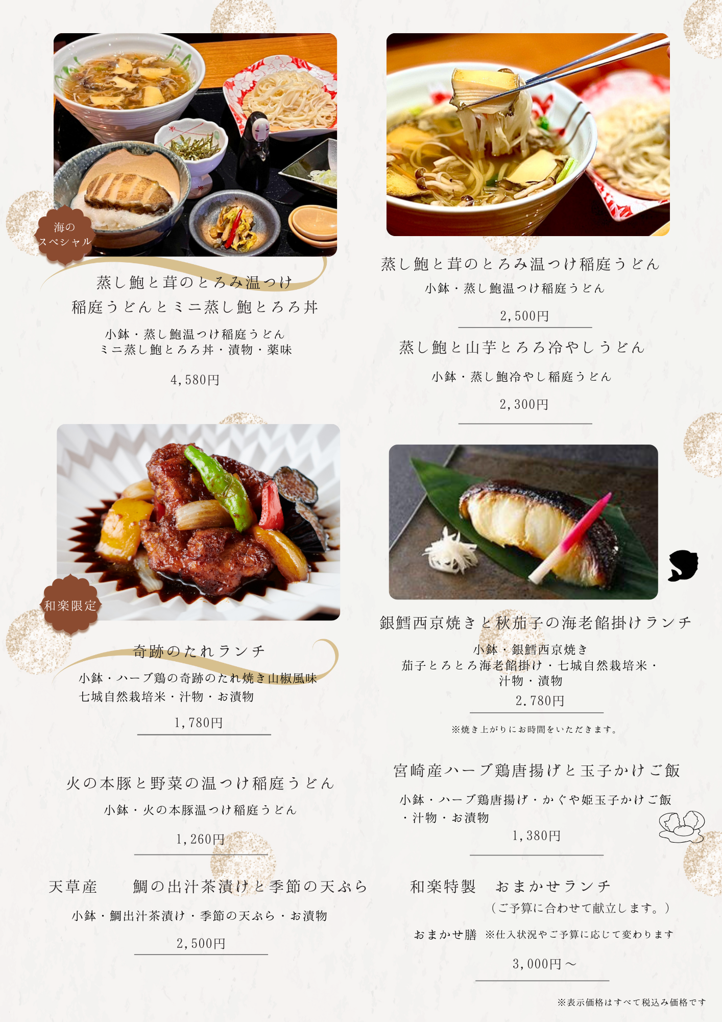 「季節料理と稲庭うどん 和楽」では、店名のように
